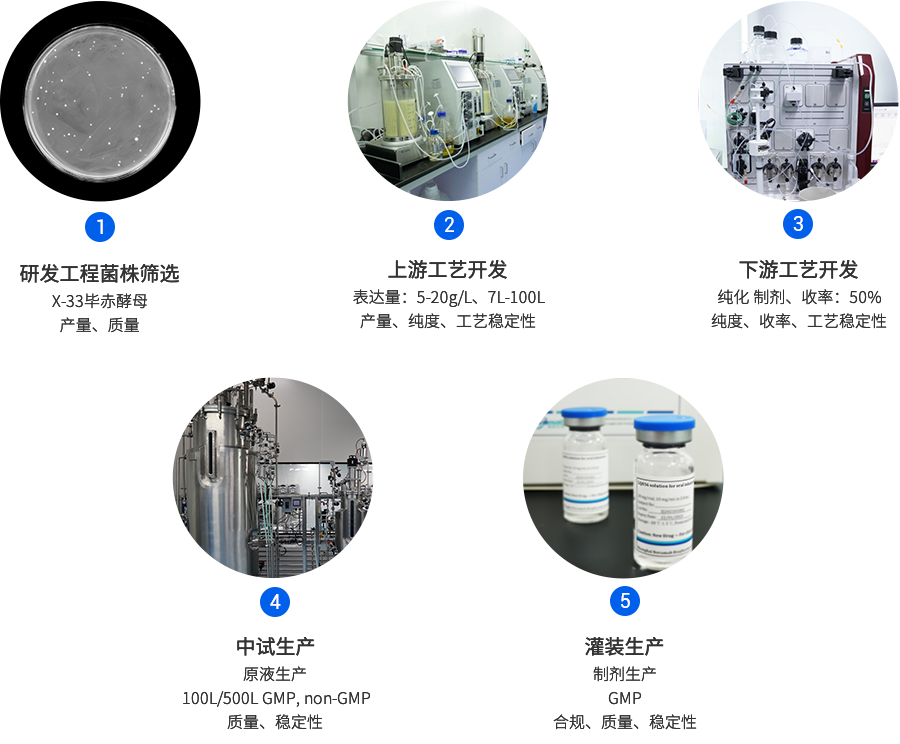 九州酷游 ku游生物已成功建立毕赤酵母CMC平台,现在已具备多个完整项目开发经验。毕赤酵母CMC平台90%以上的项目产量在1g/L以上,纯化平台工艺,其整体回收率在50%以上。从细胞株构建到蛋白纯化仅需3-4个月,极大地缩短了项目开发时间。